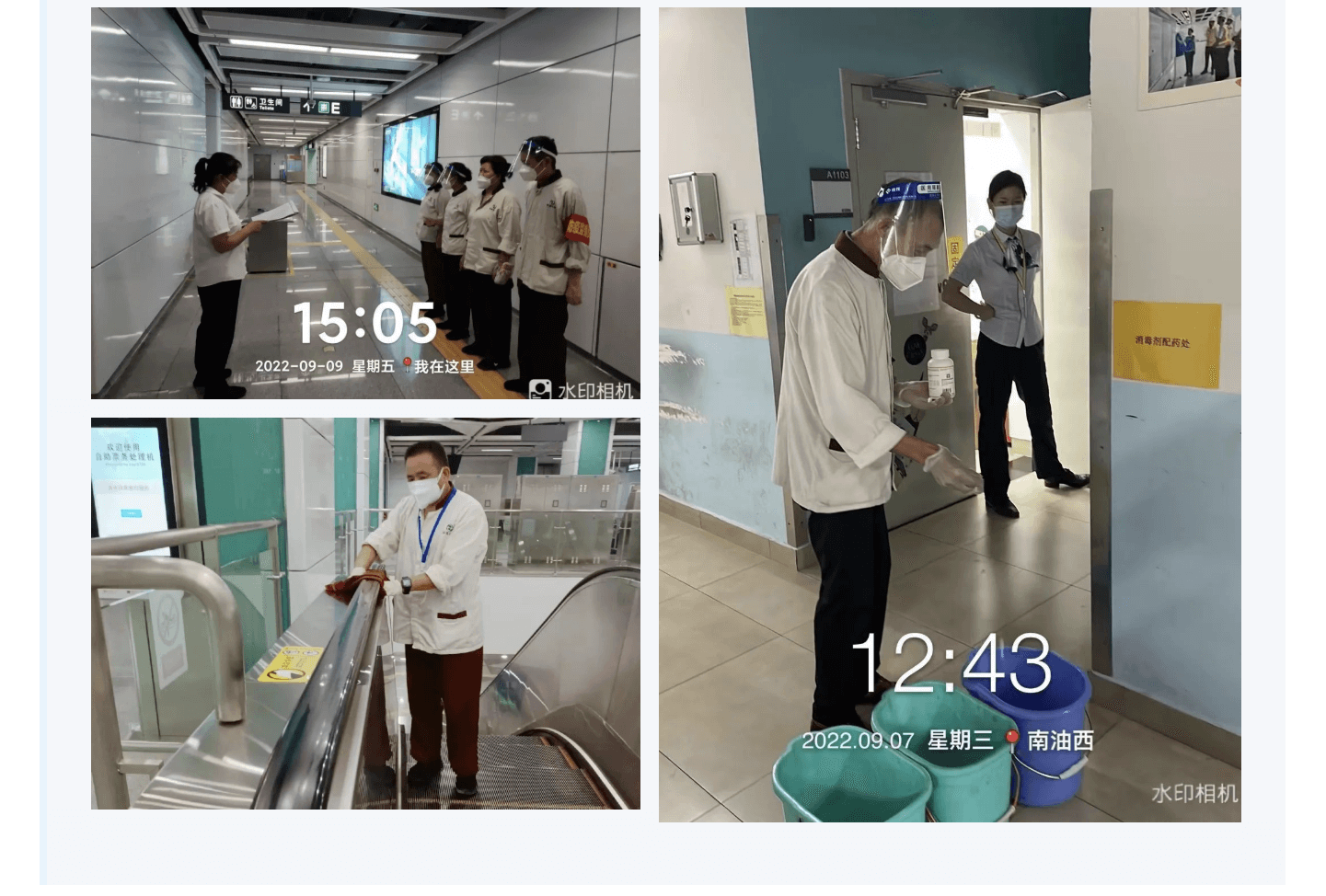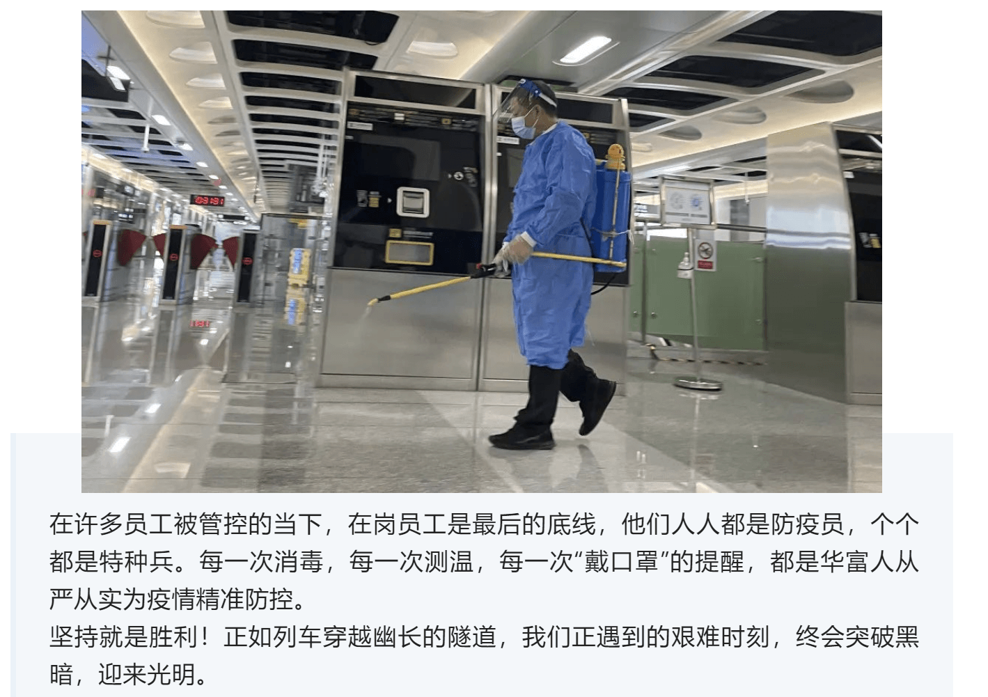 疫情面前,没有人是孤岛,这些日子,如每一个城市“逆行者”一样,许多地铁人员加班加点,他们坚守岗位,确保各区域消杀工作严格按要求配比药水,垂梯,电扶梯,大厅售票机,进出站闸机,洗手间等都必须按标准消杀到位。
