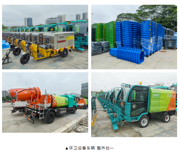 启动仪式现场,身着统一橙色环卫服的工人们精神饱满,一排排锃亮的纯电动多功能洗扫车、高压清洗车、洒水车、抑尘车(雾炮车)、护栏清洗车、桶装密闭垃圾收集车等各种新型环卫装备组成数个方阵,集体亮相。