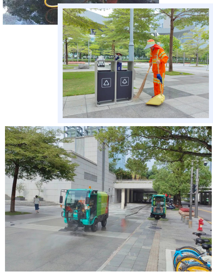 针对不同时期,项目因地制宜,采取有效措施,高效完成工作目标。在创文期间,重点对垃圾桶表面的乱张贴标语进行全面清理,并在创建文明城市活动取得了佳绩;在2023深圳第十九届文博会开幕前,采取加强道路冲洗和卫生死角清理排查、制定了现场管理应急预案,全面保障文博会的圆满召开。