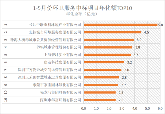 今年在深圳、佛山、乌鲁木齐等多个城市收获“城市管家”项目的万物云城,前五个月状态火热,中标项目年化总额达到3亿元,在TOP10排名第七。